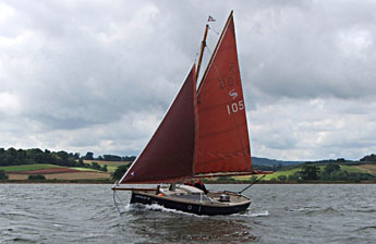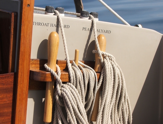 The Classic Shrimper with the addition of polyester “natural hemp” running rigging throughout, and extensive wooden and brass fittings such as wooden name boards, gunwhales, cabin/chart table, wooden tiller extension, wooden blocks, pin rail (see photo opposite), clinometer, flag staff and brass clock and barometer. |
